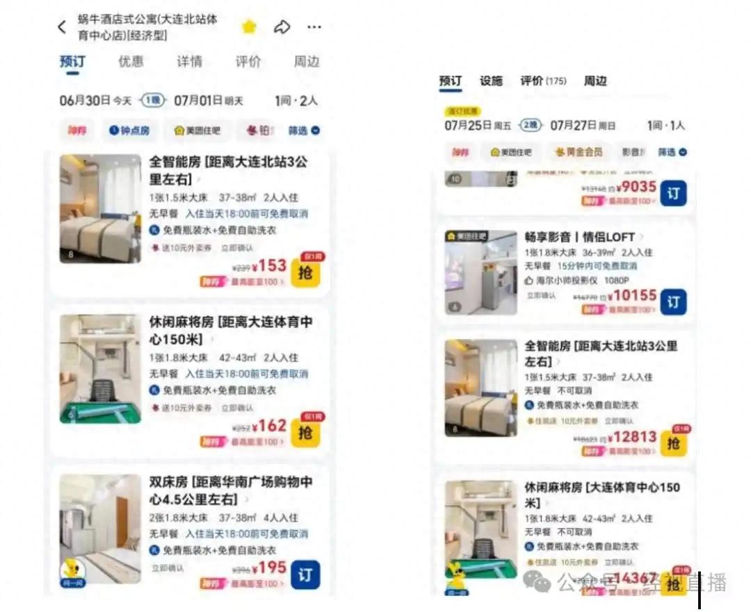 有網友發布的截圖顯示,位于大連北站體育中心附近的蝸牛酒店式公寓,其奶油風大床房價格從原本的111元一晚,飆升至演唱會期間的5570元,漲幅超過50倍;而休閑麻將房漲價幅度更為夸張,從162元直接漲至14367元,漲幅高達88倍。這一價格漲幅,遠超出正常市場波動范圍,令眾多粉絲直呼 “難以承受”。