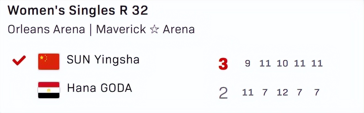 決勝局,孫穎莎與漢娜高達互不相讓,在開局階段戰(zhàn)至3-3,但是隨著孫穎莎找回狀態(tài),以及越戰(zhàn)越勇的情況下,在中局階段7-4領先漢娜高達,最終,孫穎莎以11-7拿下決勝局,孫穎莎大比分3-2淘汰漢娜高達晉級女單16強,孫穎莎下一輪的對手是陳熠和帕拉南之間的勝者。