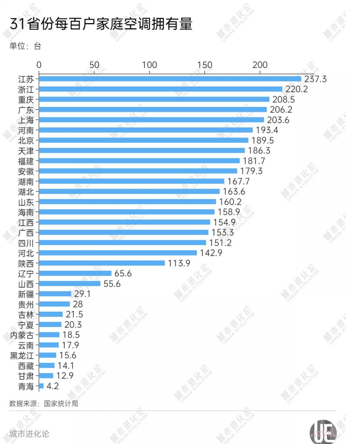 空調最多的不是四川重慶這些火爐,反而是江浙滬粵這些地方。江蘇每百戶有二百多臺,比南方還要多。可像陜西新疆這些曬得人掉皮的地方,空調反而沒那么普及。新疆朋友說他們早穿棉襖午穿紗,晚上涼快不怎么用得上。