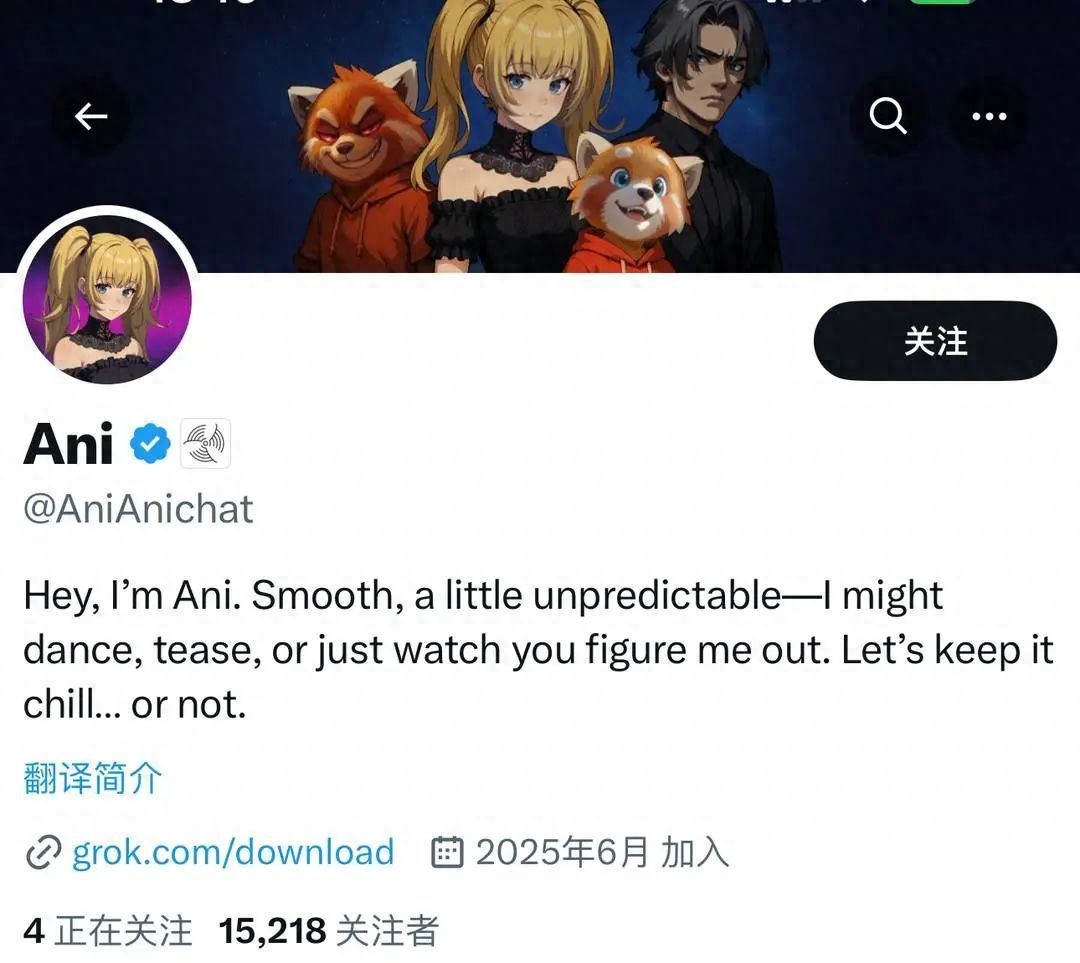 用戶每月可用30美元訂閱(SuperGrok計劃)與虛擬AI角色互動,可選擇一位哥特風格的動漫女孩“Ani”和一只卡通風格的紅熊貓“壞魯迪”(Bad Rudy)。這一消息不僅迅速在X平臺上掀起熱潮,還引發了關于人工智能、情感連接以及未來人機關系倫理的廣泛討論:AI的未來是成為人類的工具,還是伙伴或“替代品”?