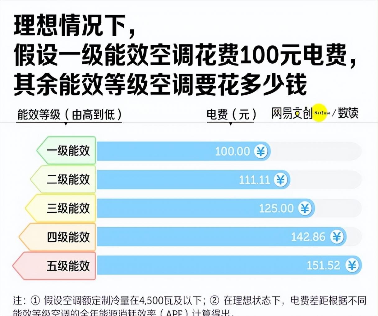 算一下,同樣制冷,五級能效比一級能效多花一半多的電費。