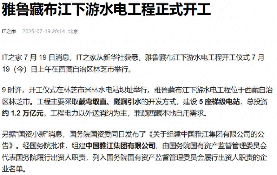 根據新華社報道,7月19日,雅魯藏布江下游水電工程正式開工。