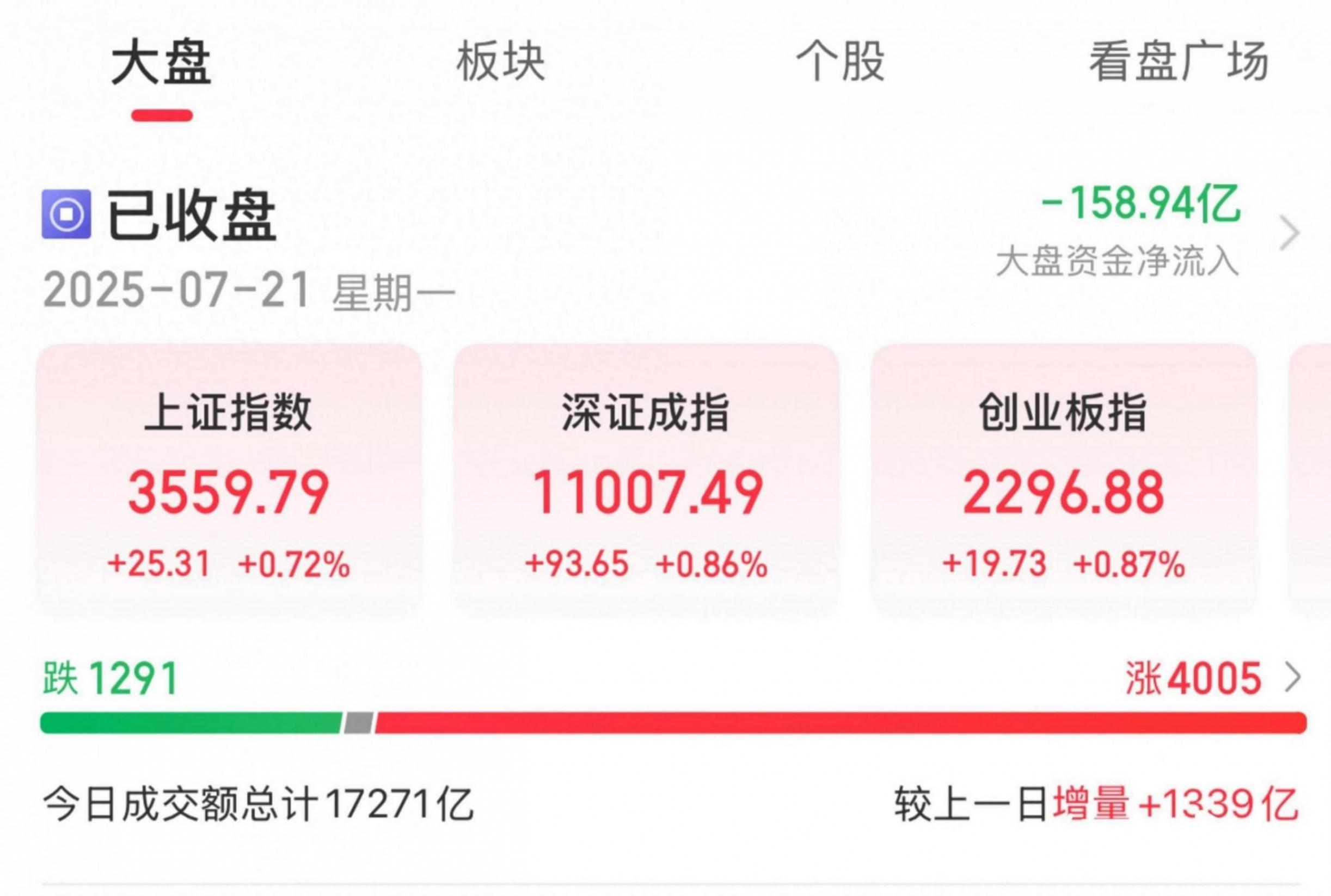7月21日,大盤延續此前漲勢。截至收盤,上證指數漲0.72%報3559.79,創年內新高,深成指漲0.86%報11007.49,創業板指漲0.87%報2296.88,北證50指數漲2.38%報1443.89.