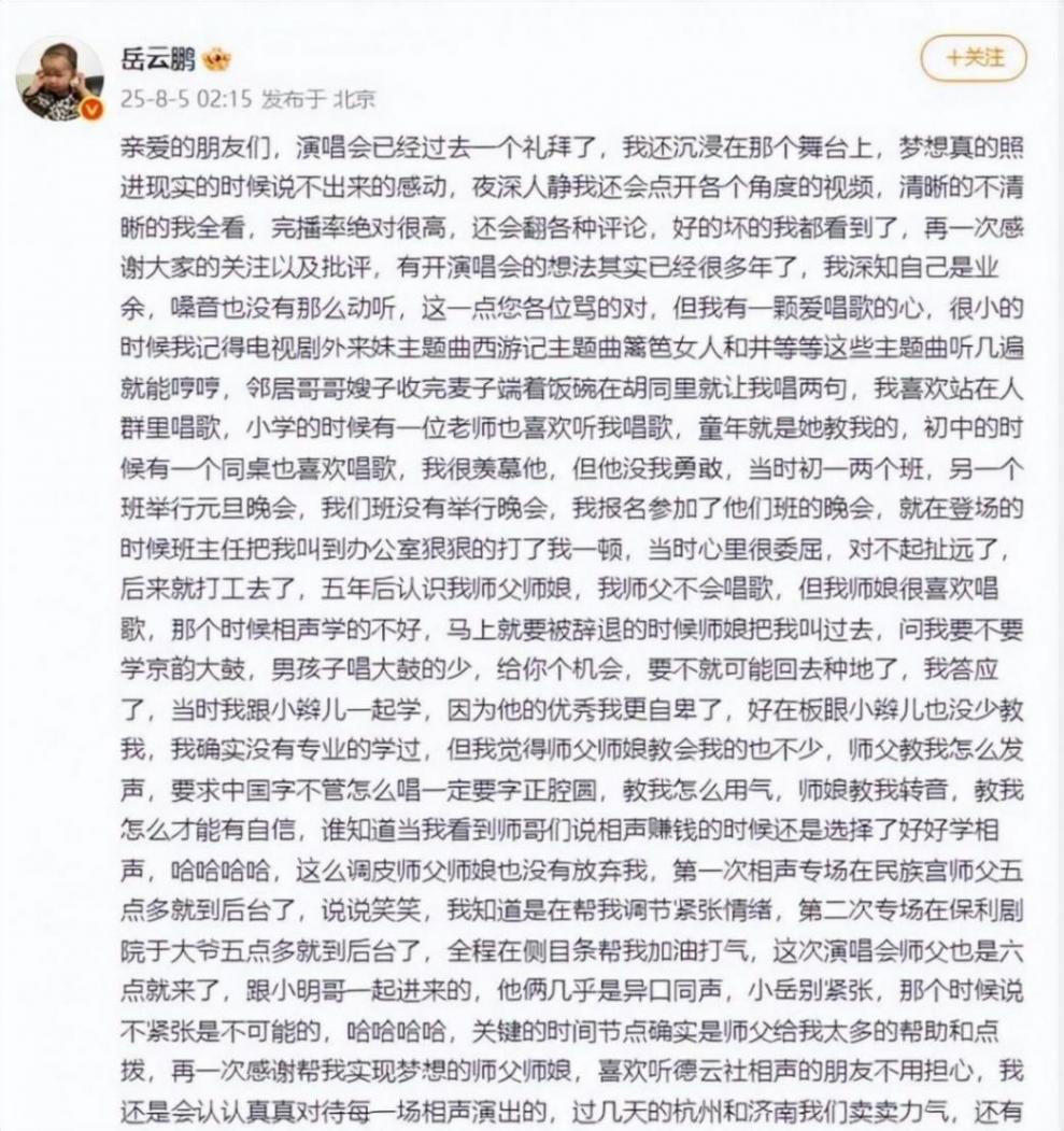 岳云鵬發(fā)長(zhǎng)文再談演唱會(huì)爭(zhēng)議,這事兒最近在網(wǎng)上炸開(kāi)了鍋。說(shuō)真的,這熱度,一點(diǎn)不比那些“頂流”差。