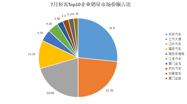 市占率維度,7月,輕客市場Top10企業市占率達到了97.46%,較上月擴大了2.23個百分點,市場集中度進一步提高,尤其是Top3企業市占率均超過了20%。