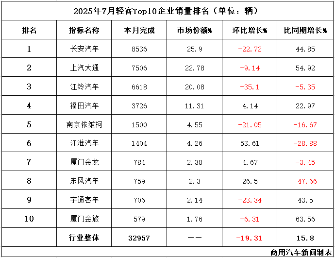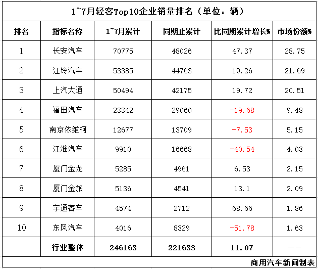 再看排名情況,與6月相比,7月輕客Top10排名發生了較大變化。其中,排名上升的企業有3家,分別是上汽大通由上月第三升至本月第二,江淮汽車由上月第七升至本月第六,廈門金龍由上月第八升至本月第七;江鈴汽車和宇通客車本月排名下降;另有長安汽車、福田汽車、南京依維柯和廈門金旅位次未發生變化。