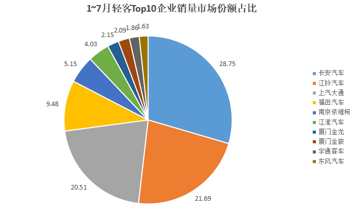 從市占率維度來看,1~7月,輕客市場Top10企業市占率達到97.34%,較1~6月擴大了0.03個百分點,變化不大。Top3市占率均超過20%,3家企業共占據70.95%的份額,較前6月略有收窄。