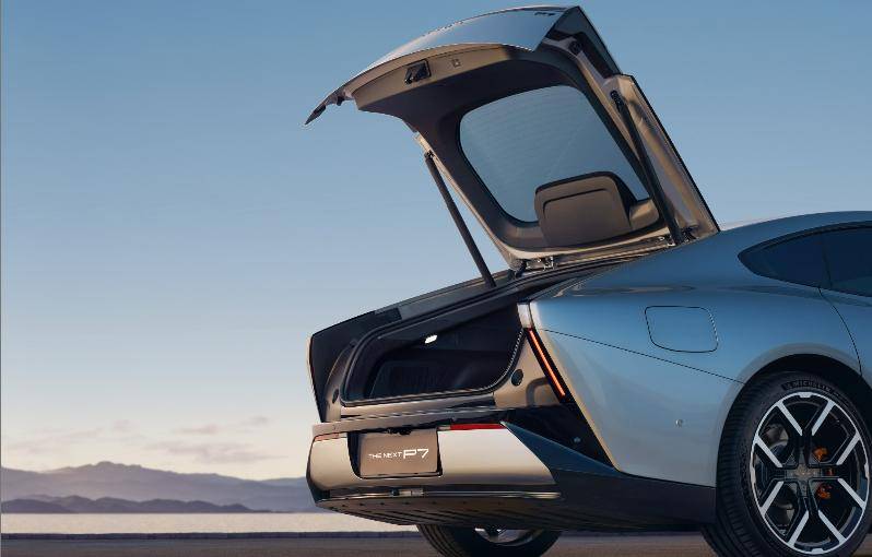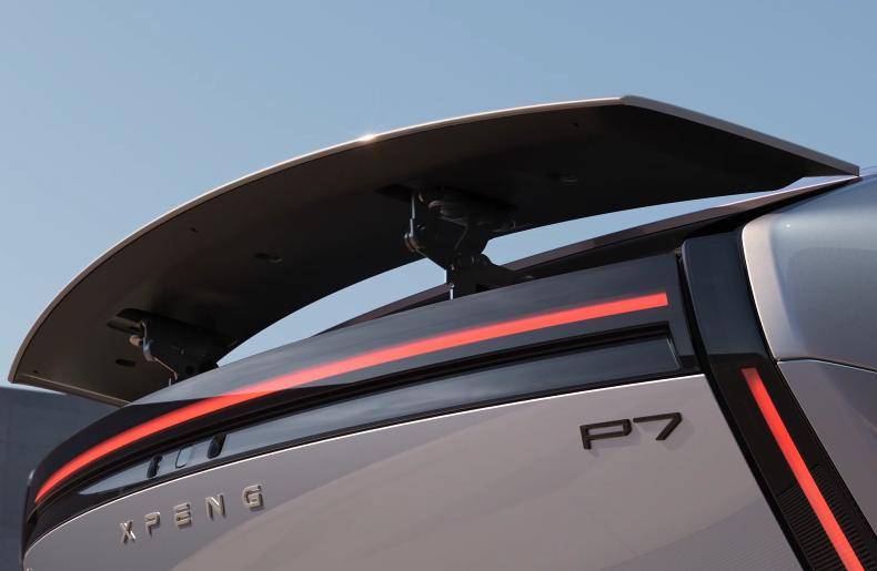 車身側面的溜背線條是轎跑的靈魂,全新小鵬P7把這份優雅做得更極致:A柱與B柱用黑色涂裝,營造出懸浮車頂的輕盈感;前翼子板的黑色裝飾件里悄悄藏了側視攝像頭,既不破壞整體線條,又暗合智能駕駛的科技屬性。最讓人驚喜的是車尾那套10檔自定義調節的電動升降尾翼——低速時它乖巧收起,保持車身流暢;高速時自動升起,不僅能增加下壓力,還能根據駕駛模式調整角度,成了名副其實的“性能暗號”。