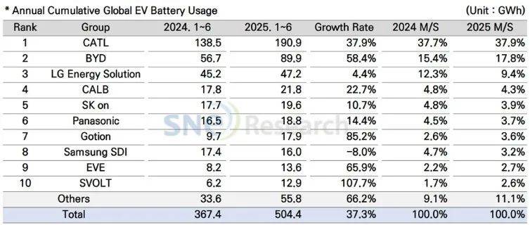 根據(jù)韓國研究機構(gòu)SNE Research的最新數(shù)據(jù),2025年上半年全球電動汽車(EV、PHEV、HEV)動力電池裝機量504.4GWh,同比增長37.3%。而曾經(jīng)不可一世的日韓電池廠商,市場份額進一步下滑。