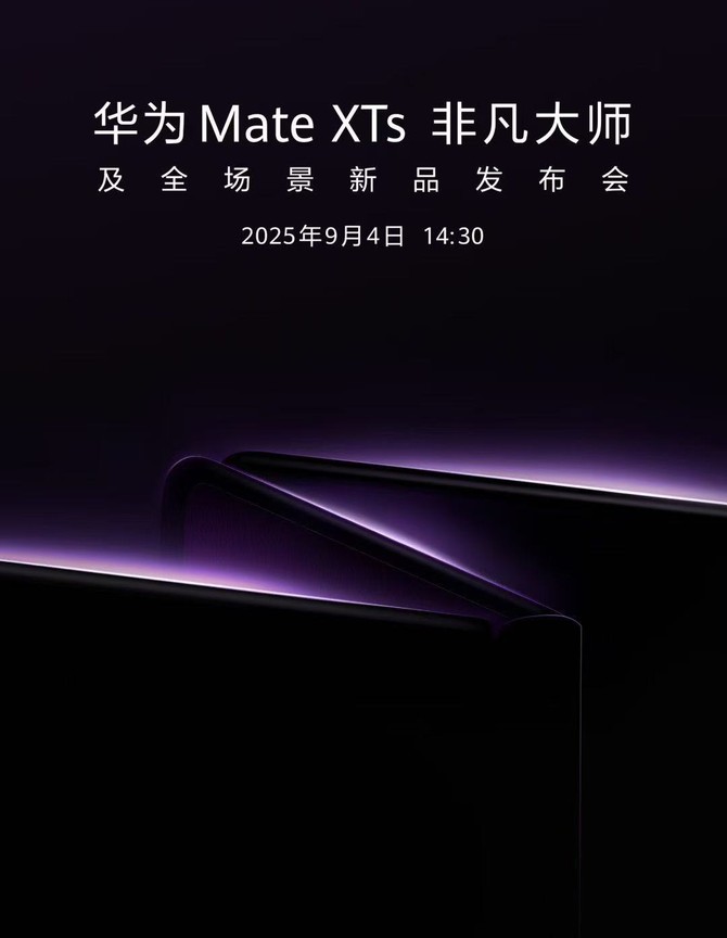 同時,華為終端正式發布了華為Mate XTs 非凡大師及全場景新品發布會的官宣海報,確認新品發布會將于 9 月 4 日正式舉辦。屆時,這款備受期待的新款三折疊手機將正式亮相,向全球消費者展示華為在折疊屏技術領域的最新成果。
