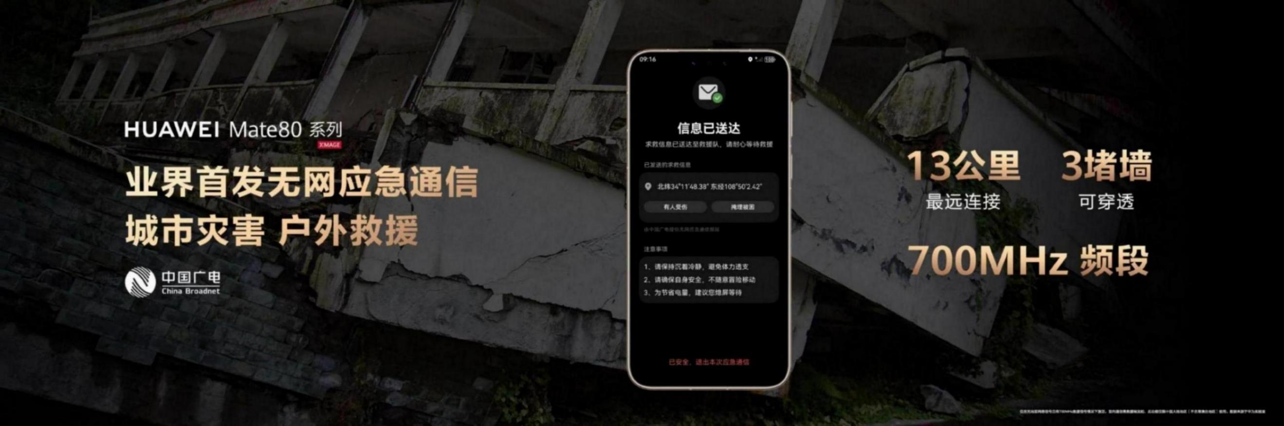 值得注意的是,Mate80系列業界首發700MHz無網通信,在地震、洪水或是野外失聯等斷網險情下搭建生命通道,打通用戶與救援隊“最后一公里”的溝通鏈路。700MHz應急頻段救援信號,可以穿透3層樓的深度,覆蓋超過13公里的通信距離。