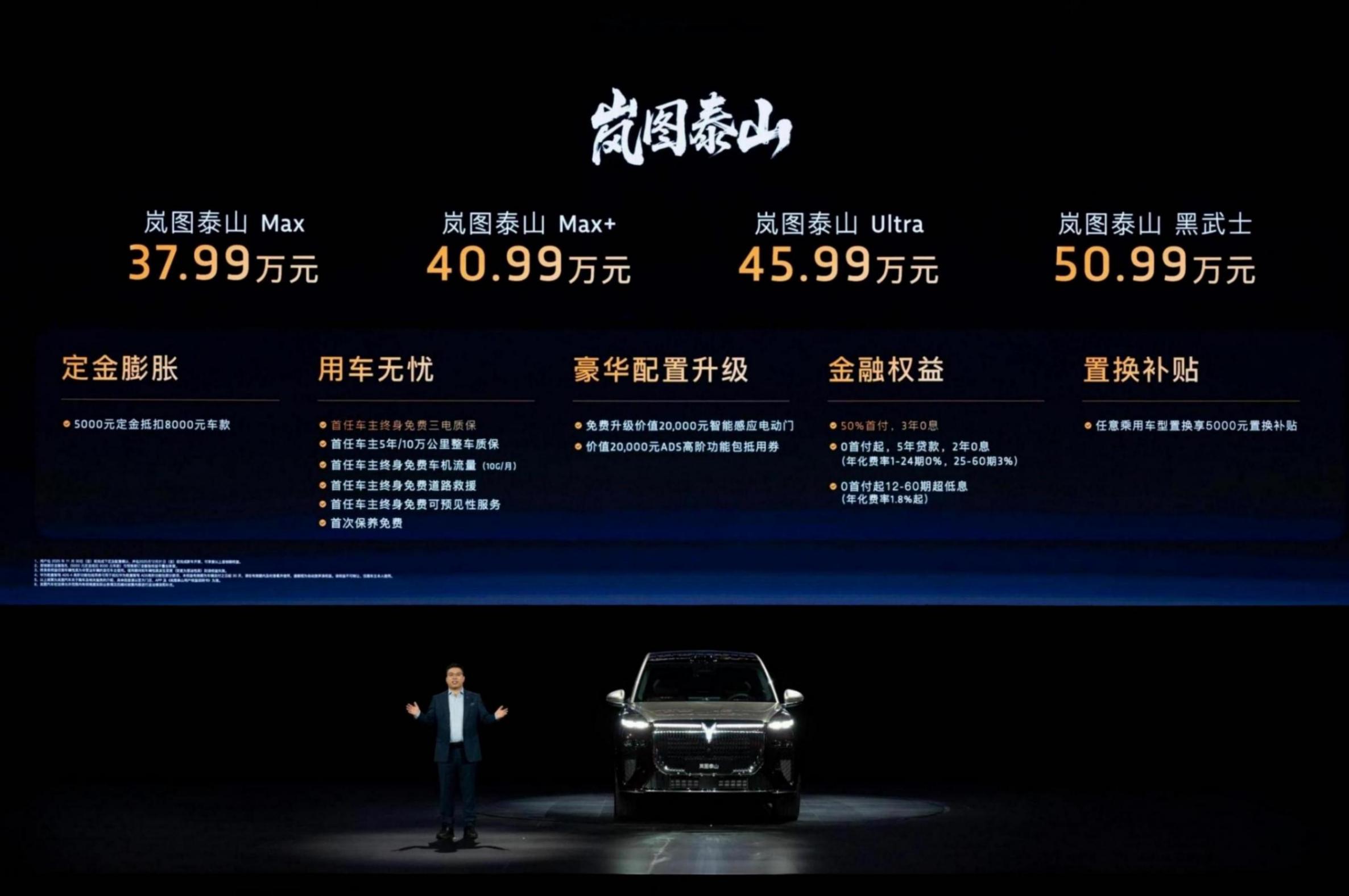 11月18日,深圳國際會展中心,嵐圖汽車以 “爭峰”為主題的發(fā)布會吸引了整個行業(yè)的關(guān)注。嵐圖泰山正式亮相,共推出四個版型,官方指導(dǎo)價為37.99萬元-50.99萬元。