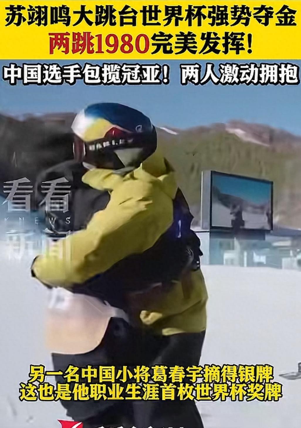 11月29日,在國際雪聯大跳臺世界杯云頂站單板滑雪男子決賽現場,蘇翊鳴以總分174.50分強勢拿下賽季首冠,另一位中國小將葛春宇摘得銀牌,中國選手包攬冠亞,兩人激動擁抱的畫面看得人熱血沸騰。