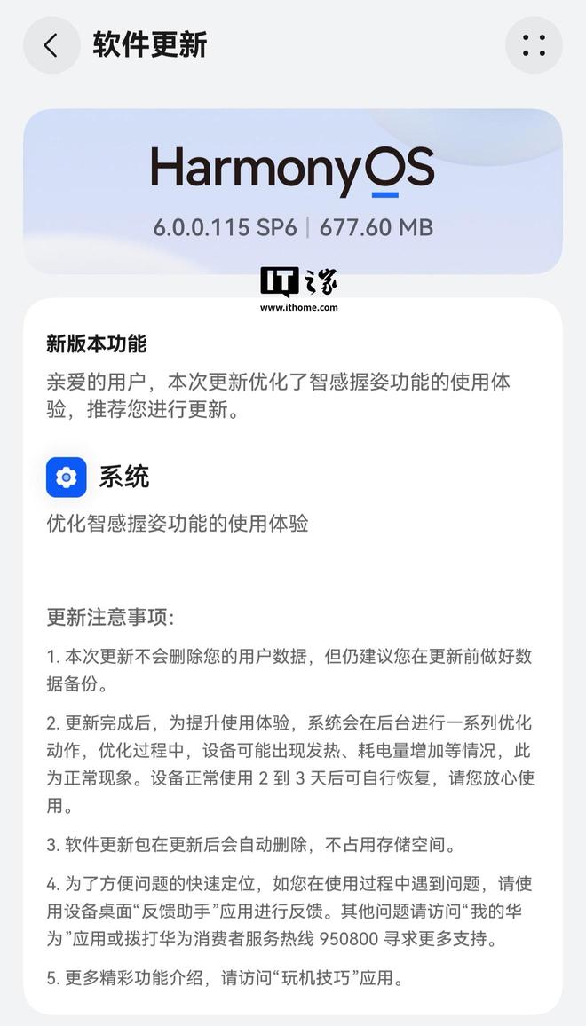 11 月 29 日消息,華為 Mate 70 Air 手機今日開啟鴻蒙 HarmonyOS 6.0.0.115 SP6 版本升級,系統包大小約 677.60 MB。據介紹,本次更新優化了智感握姿功能的使用體驗(Mate 70 Air 首個 HarmonyOS 6 版本已支持智感握姿功能,但未顯示在更新日志中)。