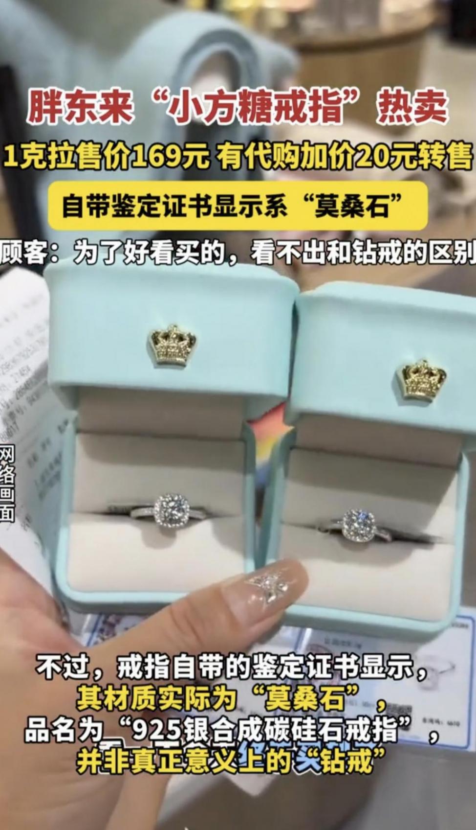 一個看著跟真鉆石一模一樣,方方正正亮閃閃的“小方糖戒指”,標著“1克拉大小”,在胖東來就賣169塊。這價格一出來,直接把大伙兒給整不會了。線下排隊搶,線上還有人加價20塊求代購,跟搶限量款球鞋似的。