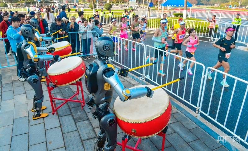 光谷馬拉松現場,人形機器人為選手加油(央廣網發 光谷馬拉松組委會供圖)