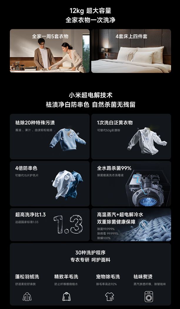 IT之家從官方介紹獲悉,洗衣機方面采用小米超電解技術,支持祛除 20 種特殊污漬、1 次洗白泛黃衣物、4 倍防串色、全水路殺菌 99%、超高洗凈比 1.3、高溫蒸汽 + 超電解冷水雙重除菌。此外,該產品還支持 30 種洗護程序,包括蓬松羽絨洗、精致羊毛洗、寵物除毛洗、祛味熨燙等,接入小米澎湃智聯、雙路智能投放。